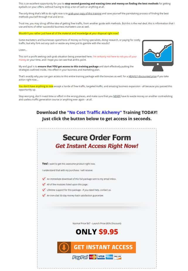 This fully stocked and very detailed training guide / e-book delves deep into the aspects of no cost traffic alchemy and everything to do with that topic.