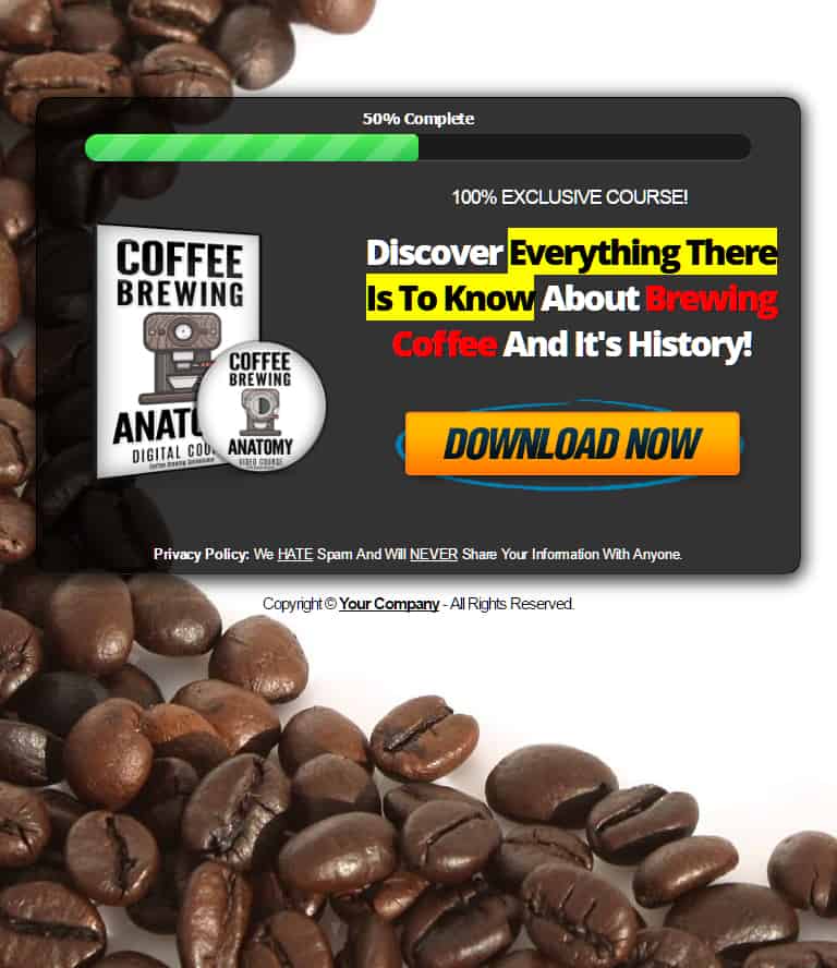 You can seriously set up this coffee brewing report funnel in this package within just a few minutes. The included step-by-step guide packaged with the report will take you by the hand and walk you through the process of setting up the report, the squeeze page and everything else.