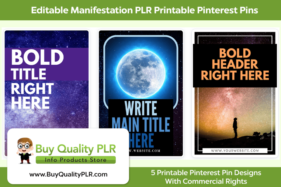 The Editable Manifestation PLR Printable Pinterest Graphics is just for you if you’re looking for printable Pinterest graphics that can be used to create your own unique printables and profit! Perfect for you if you have a publishing business and are looking for new products or printables.