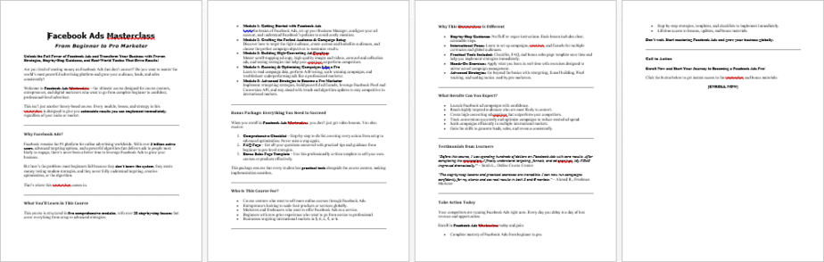 This comprehensive training program guides learners step-by-step from complete beginner to confident Facebook ads marketer. It explains the fundamentals, breaks down campaign setup, teaches optimization strategies, and introduces advanced tactics that separate amateurs from professionals.