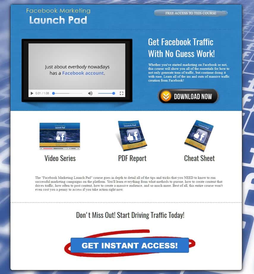 This course goes in depth to detail all of best methods for generating traffic using Facebook. It’s evergreen, meaning if Facebook changes, these methods will still be useful. This course is the best way to build a list of Facebook marketers, business owners, and marketers in general.