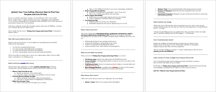This powerful, structured personal development course helps learners move from confusion to clarity—step by step. It combines self-discovery, mindset work, actionable planning, and long-term purpose integration into a complete transformation roadmap.