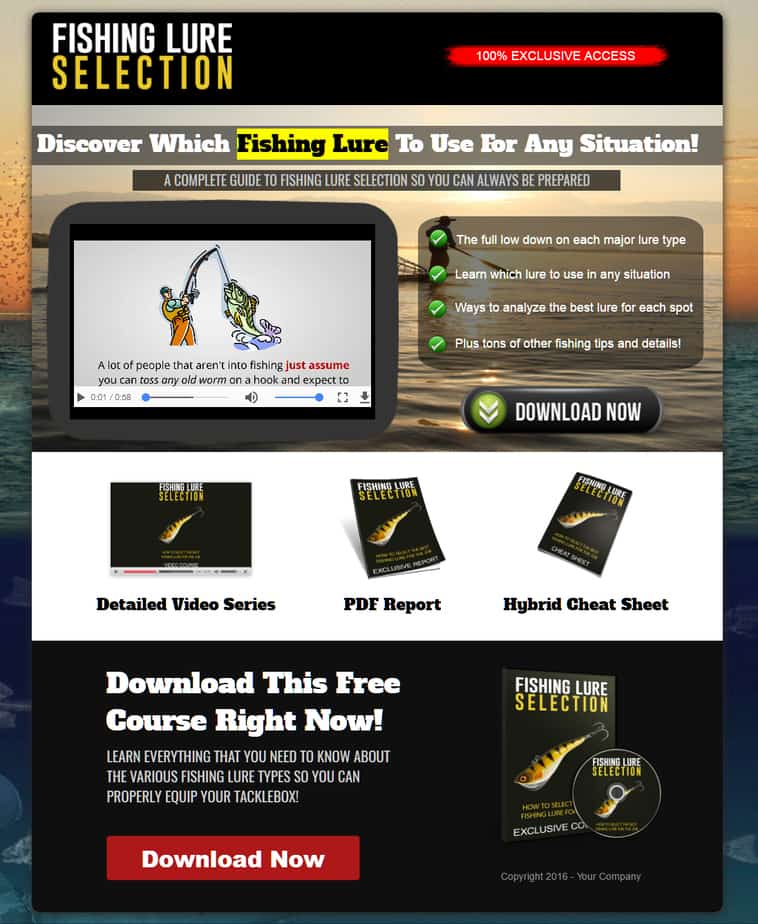 This Fishing Lure Selection PLR report is not just run-of-the-mill low-quality reproduced “giveaway report” with PLR attached. This report is extremely well researched, perfectly written, and based on topics and methods that have worked for ages and will continue to work for many years to come. But that’s just the tip of the ice-berg: The report front end comes with 10 modules (including the report and document for editing) that perfectly correspond to that particular report. This includes squeeze pages, download pages, high quality graphics, email swipes, social media posts, recommended affiliate products and more. All for making using this report an absolute breeze in your business.