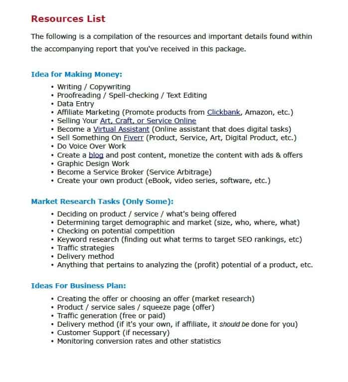 This make money online PLR report is not just run-of-the-mill low-quality reproduced “giveaway report” with PLR attached. This report is extremely well researched, perfectly written, and based on topics and methods that have worked for ages and will continue to work for many years to come. But that’s just the tip of the ice-berg: The report front end comes with 10 modules (including the report and document for editing) that perfectly correspond to that particular report. This includes squeeze pages, download pages, high quality graphics, email swipes, social media posts, recommended affiliate products and more. All for making using this report an absolute breeze in your business.