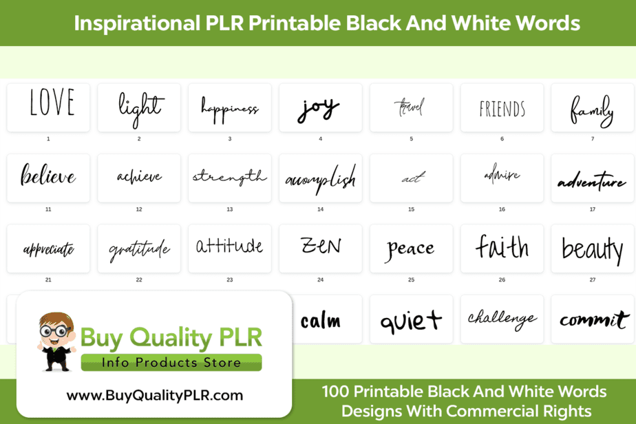 Introducing our Inspirational PLR Printable Black and White Words – a collection of powerful, uplifting, and motivational words that you can use to create stunning printables for your personal or business use. With this PLR (Private Label Rights) package, you’ll have the freedom to customize, brand, and sell or distribute these printable words as your own, allowing you to inspire and uplift others with your unique touch.