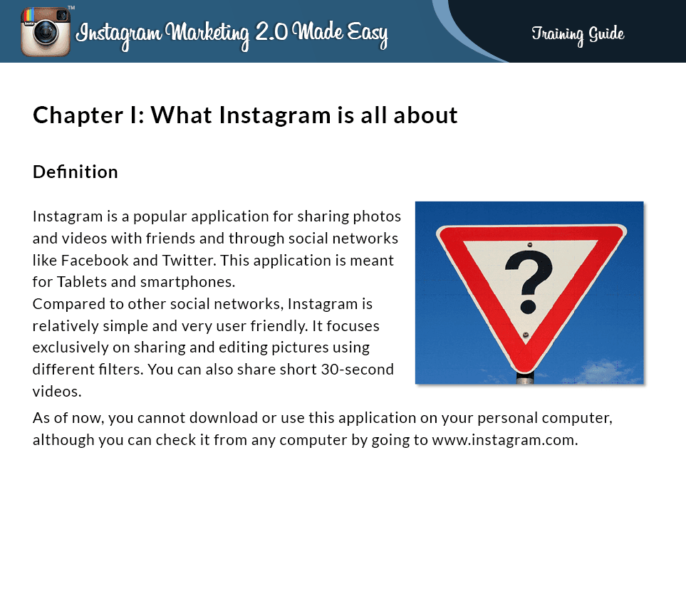 This unique and easy to understand Training Guide will supply you the most accurate information needed to get best results for your business by using Instagram Marketing.