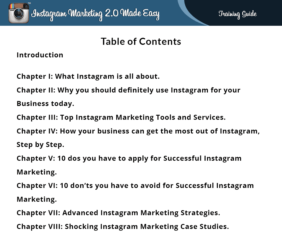 - Chapter VI: 10 don’ts you have to avoid for Successful Instagram Marketing.