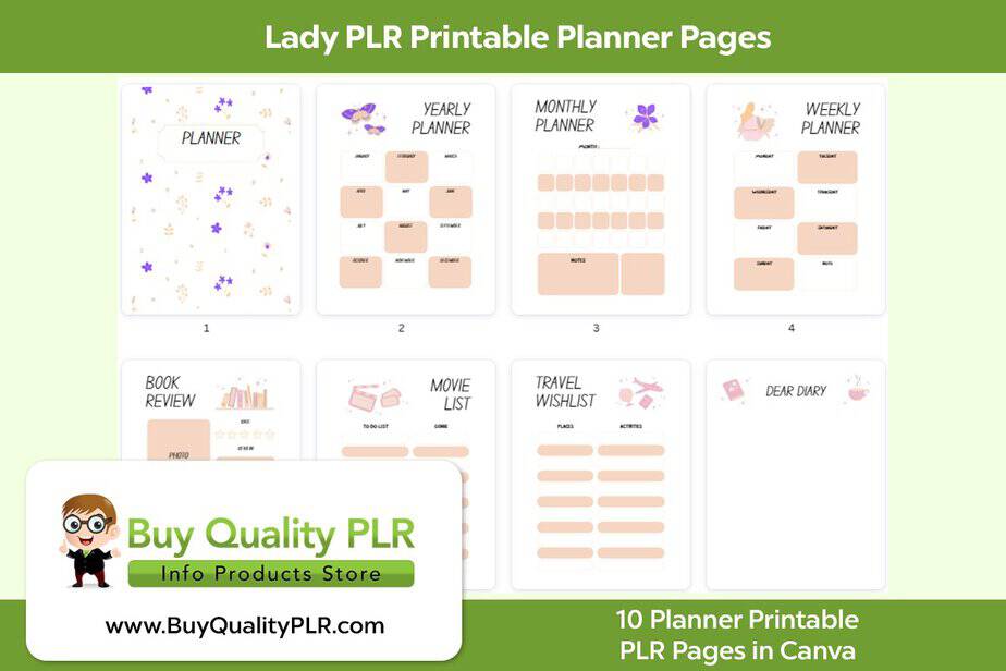 The Lady PLR Printable Planner Pages provides 10 Printable Planner Pages. All files are easy to edit via Canva and publish to create new unique products and PLR printables that you can sell for profit on your low-content publishing store or use these templates for your designs.