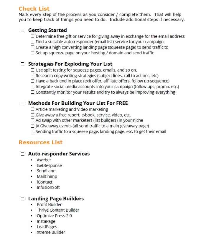 Email List Builder: The focus of this report is to build your e-mail list and establish authority and trust. Give this report away using the provided squeeze page.