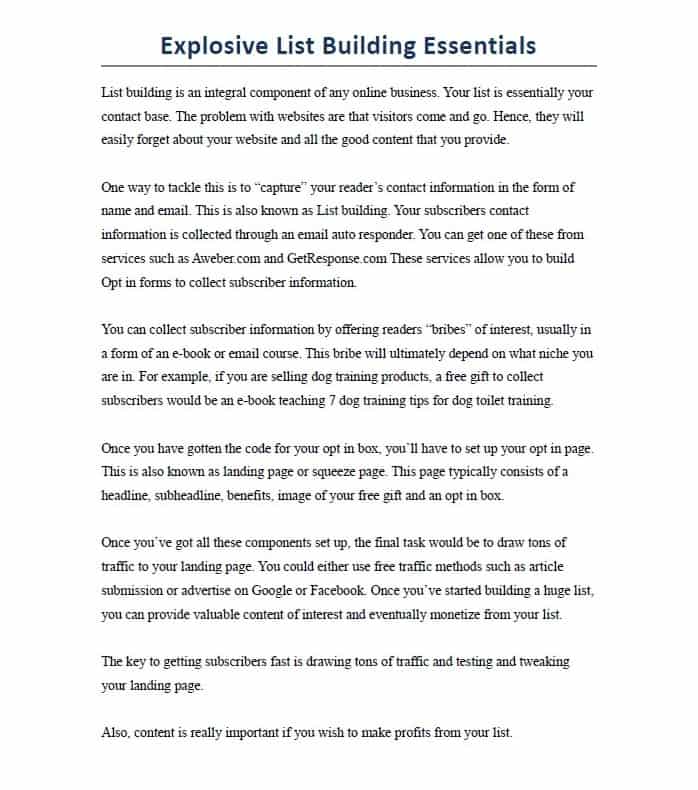 This list building report will provide the leads you distribute it to with the inspiration, motivation, and knowledge to further their online money making adventure. As opposed to just handing them to some bottom tier completely useless information, you’re giving subscribers an actionable report that they can utilize to improve their efforts all around.