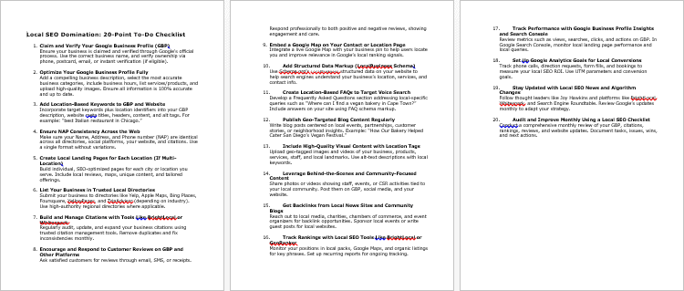 - Local SEO Checklist (652 Words): Step-by-step actionable list to implement Local SEO strategies quickly.