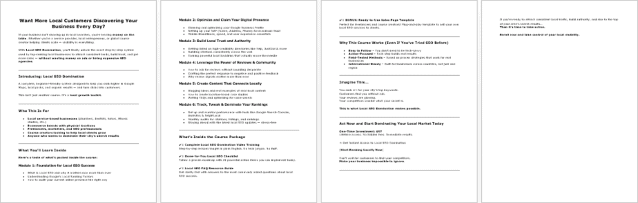 - Local SEO Salespage (636 Words): Ready-made sales copy to sell the course immediately.