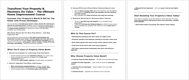 Studies show that well-maintained, modern, and functional homes sell faster and at higher prices than properties with dated features or poor presentation. By following the Property Value Boost course, homeowners can: