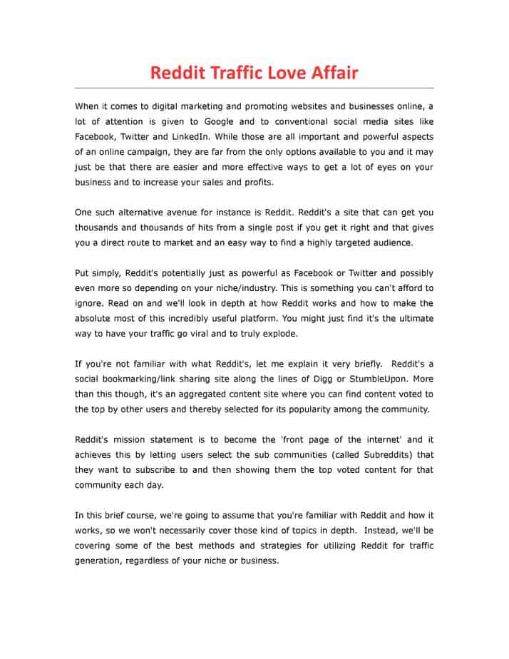 The length of the Reddit Traffic PLR report is over 2,600+ words of top tier well written content covering the following:
