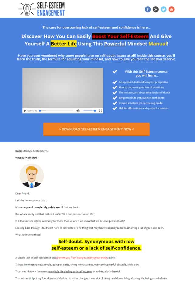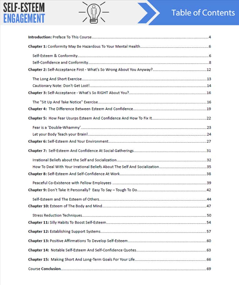 From the very beginning starting with the science behind self-esteem, all the way through addressing it, changing habits and perspective, strategies to practice, and everything else in between. It’s all included and it’s all completely geared for ANY person to benefit from it.  Most people overlook a lot of the strategies that DO work and are outlined in this entire self-esteem course. That means they’re going to not only understand these methods now, but also how they’re going to be effective in improving their self-esteem and self-image immensely.