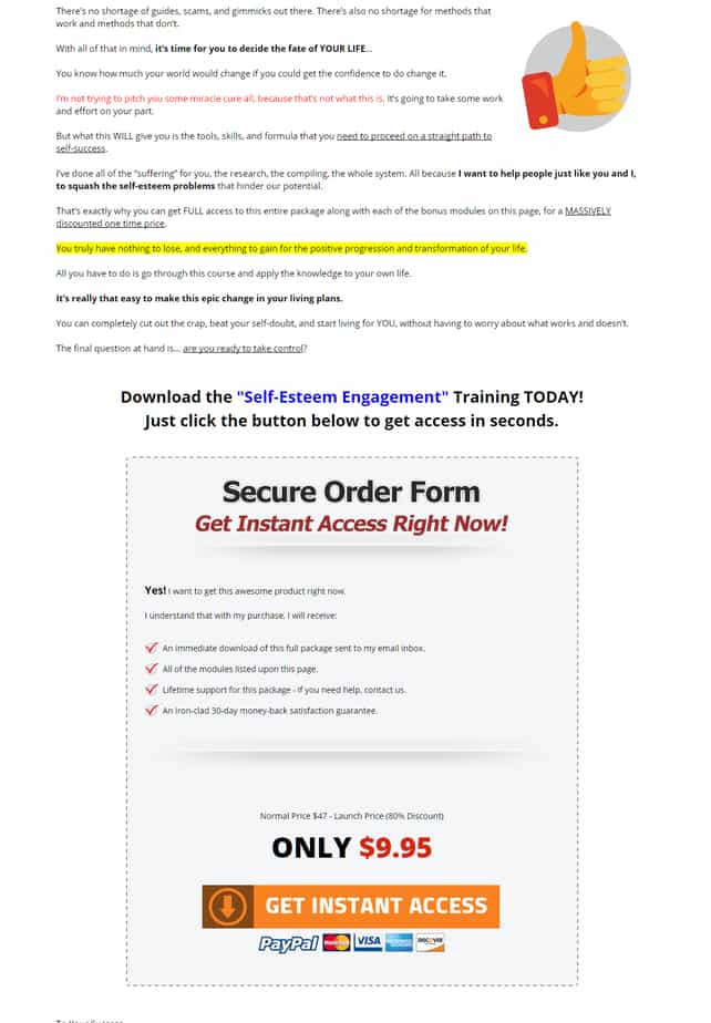 All of the hard work, effort, and methodologies that can transform your life into what you deserve and eliminate your lack of self-esteem are fully laid out and done for you. You just need to get your hands on this package and apply these PROVEN tactics to make certain that you NEVER have to let self-doubt prevent you from living your life to the fullest potential again.