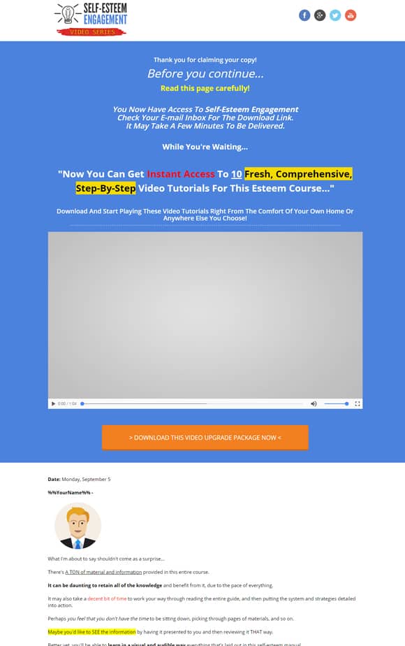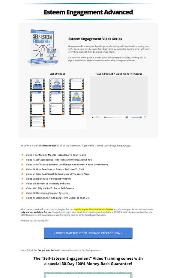 Now you can kick start your knowledge on eliminating self-doubt and improving your self-esteem (and life), because this 10 part step-by-step video training series will cover everything inside of the e-book guide AND more.