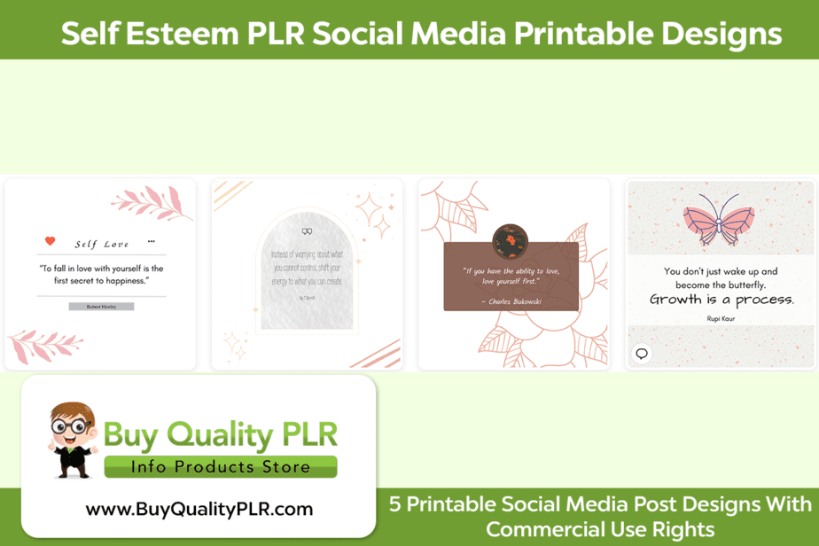 Are you looking for high-quality PLR content on the topic of self-esteem? Look no further than BuyQualityPLR.com! Our Self-Esteem PLR package includes a range of materials that will help you create engaging content for your audience, including social media posts and printable designs. Our package also includes ready-to-use social media posts, so you can quickly and easily engage with your followers on Facebook, Twitter, and other social platforms. With eye-catching graphics and attention-grabbing text, these posts are perfect for building your online presence and driving traffic to your website.