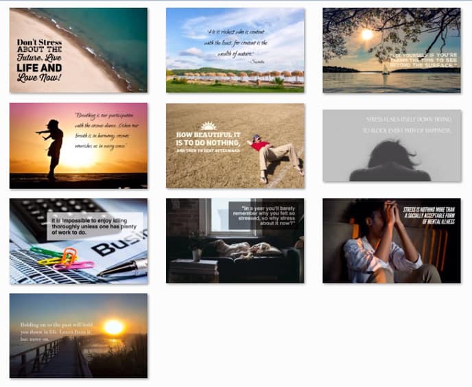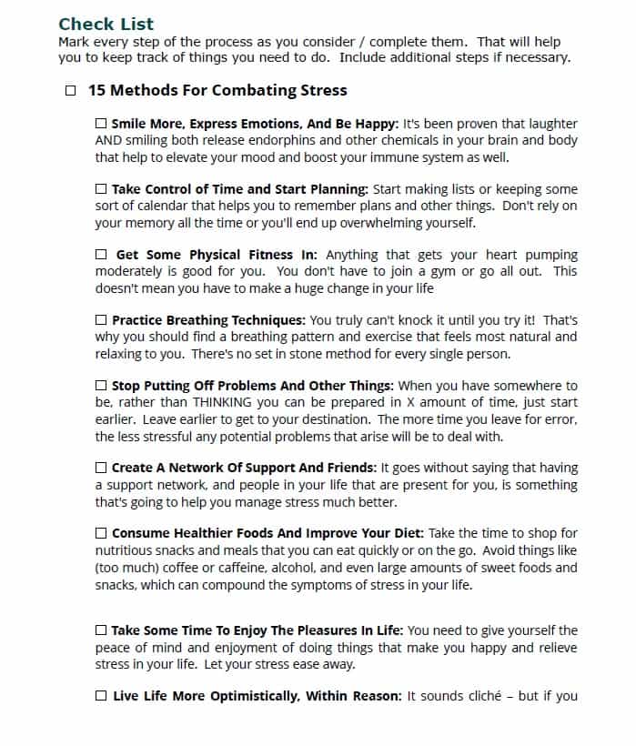 The actual content covers topics such as setting goals to cut stress, focusing on “alone time” to decompress, living life more optimistically, dieting and habit adjustments, using support networks, eliminating procrastination effectively, and so many other topics. It’s a great primer for any personal development or self-help course or business.
