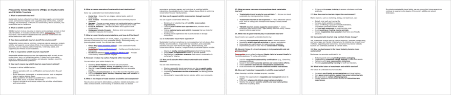 - Sustainable and Wildlife Tourism – FAQs (1,062 words): Clear guidance for common questions and challenges in eco-friendly tourism.