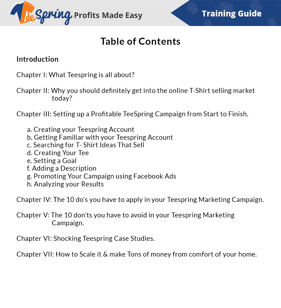 - Chapter III: Setting up a Profitable TeeSpring Campaign from Start to Finish.