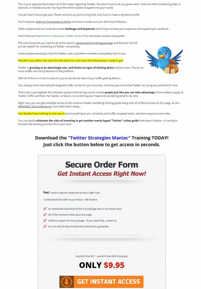 You don’t have to scratch your head and wonder how other businesses are successfully using Twitter to fuel their traffic generation needs and boost their conversions. You just need to take control and apply this powerful and proven Twitter marketing system into action today.