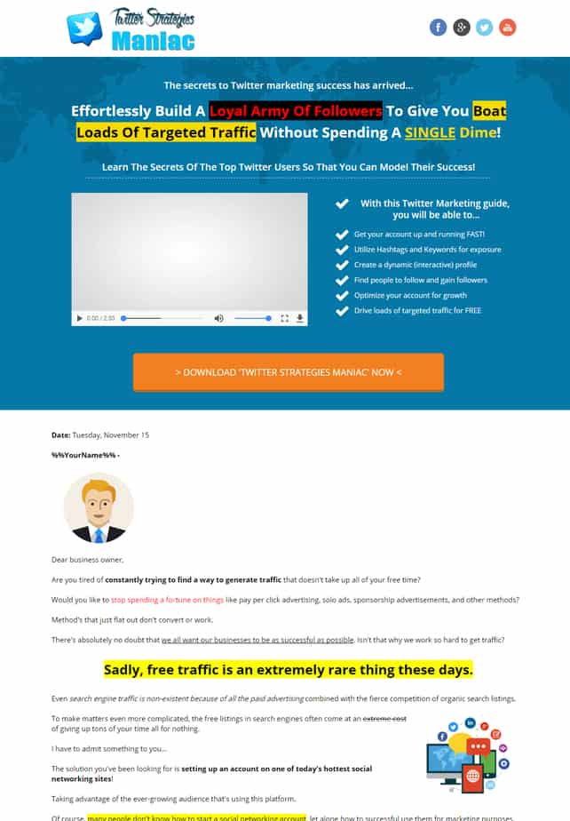 Learning the full in’s and out’s of marketing on Twitter successfully, and thus getting tons of completely FREE highly targeted traffic to your websites, is truly as simplified as just grabbing your copy of this insanely thorough product and absorbing everything inside.