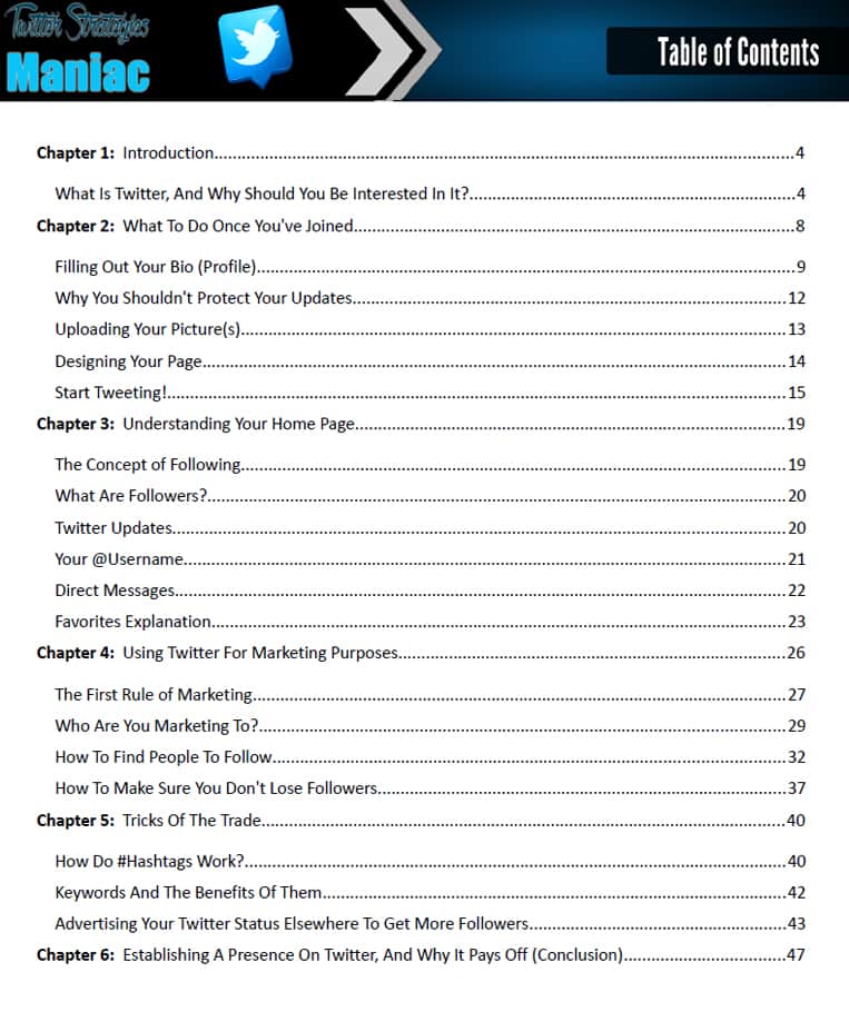 This is just a brief summary of all of the chapters and sections that are laid out in this Twitter marketing PLR training system: