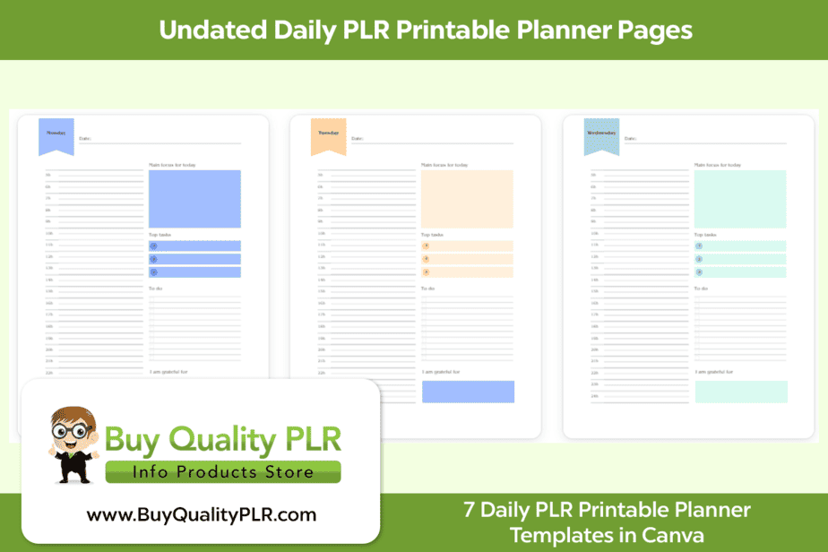 The Undated Daily PLR Printable Planner Pages provide you with 7 Daily Planner Templates. All files are easy to edit via Canva and publish so that you can create new unique products and PLR printables that you can sell for profit on your low-content publishing store or use these templates for your own designs.