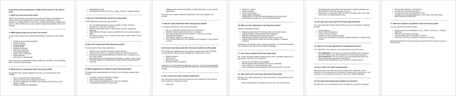 - Work From Home Jobs FAQs (983 words) – Pre-written answers to common objections and concerns (legitimacy, tools, experience level, pay expectations, interviews, and more).